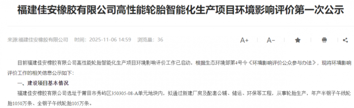 【炭黑產業網】11月7日消息,11月6日,福建莆田市秀嶼區發布的一則環評公示,正式披露了輪胎行業的一項重磅投資計劃。福建佳安橡膠有限公司計劃投建“高性能輪胎智能化生產項目”,該項目規劃的年產能規模達到1155萬條,引發行業廣泛關注。