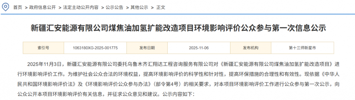 11月6日,新疆匯安能源有限公司煤焦油加氫擴(kuò)能改造項(xiàng)目環(huán)境影響評價公眾參與第一次信息公示。