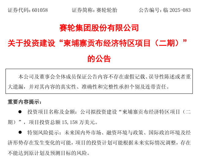 【炭黑產(chǎn)業(yè)網(wǎng)】12月4日消息,12月3日晚間,賽輪輪胎(601058)發(fā)布公告稱,計劃投入1.52億美元,推進柬埔寨貢布經(jīng)濟特區(qū)項目(二期)的建設(shè)工作。此項目將由賽輪輪胎在柬埔寨的全資子公司——貢布灣投資具體執(zhí)行,預(yù)計建設(shè)周期為12個月。項目投產(chǎn)后,預(yù)計可實現(xiàn)年收入2.08億美元,利潤總額達(dá)6948萬美元,此舉將助力賽輪輪胎進一步優(yōu)化其全球產(chǎn)業(yè)布局,完善供應(yīng)鏈體系。