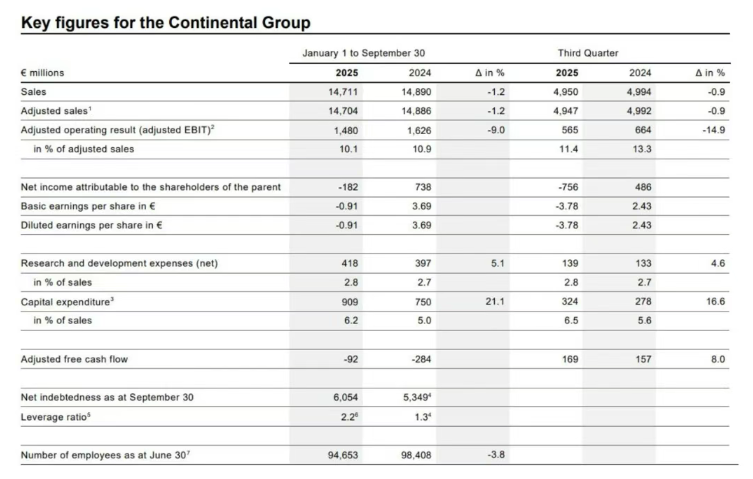 大陸集團(tuán)首席財(cái)務(wù)官Roland Welzbacher表示,第三季度財(cái)務(wù)業(yè)績(jī)受戰(zhàn)略調(diào)整帶來(lái)的一次性特殊影響決定。與第二季度相比,輪胎、康迪泰克和自由現(xiàn)金流顯著改善。展望最后一個(gè)季度,目標(biāo)是進(jìn)一步改善現(xiàn)金流和康迪泰克業(yè)務(wù),嚴(yán)格成本紀(jì)律將助力這一努力,預(yù)計(jì)工業(yè)需求也將略有復(fù)蘇。2025年前三個(gè)季度,德國(guó)大陸集團(tuán)總銷售額147.1億歐元(約合人民幣1206億元),同比下滑1.2%;調(diào)整后營(yíng)業(yè)利潤(rùn)14.8億歐元(約合人民幣121.3億元),同比下降9%;凈利潤(rùn)為 -18.2億歐元,主要是歐摩威分拆和出售OESL對(duì)利潤(rùn)產(chǎn)生多種負(fù)面影響。